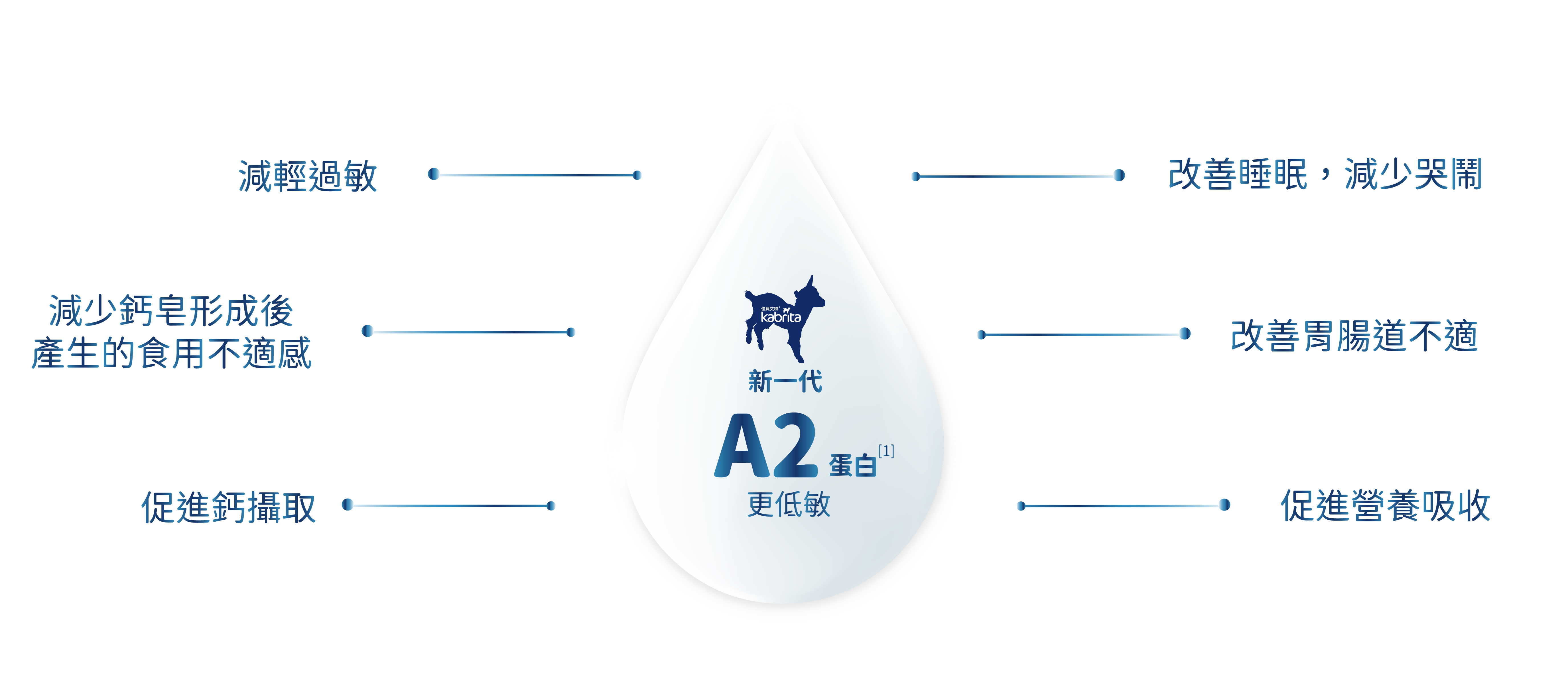 新一代佳貝艾特®Kabrita®專利配方¹²,結合天然A2酪蛋白,進一步減低腸胃不適的可能,低敏組合貼近母乳。